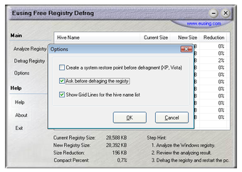Y, además, Eusing Free Registry Defrag permite crear un punto de restauración. Así, si la desfragmentación no ofrece los resultados deseados, podrás recuperar el estado previo del Registro.